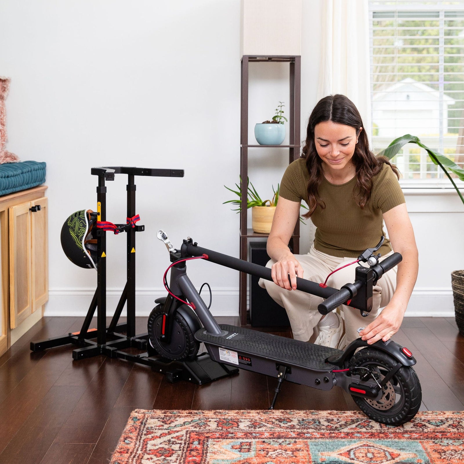 Dock your e-scooter with The Meerkat E-Scooter Stand and Accessory Hub, a catchall storage solution for your scooter and gear. The Meerkat is engineered to enhance the electric scooter experience and make every ride extraordinary.